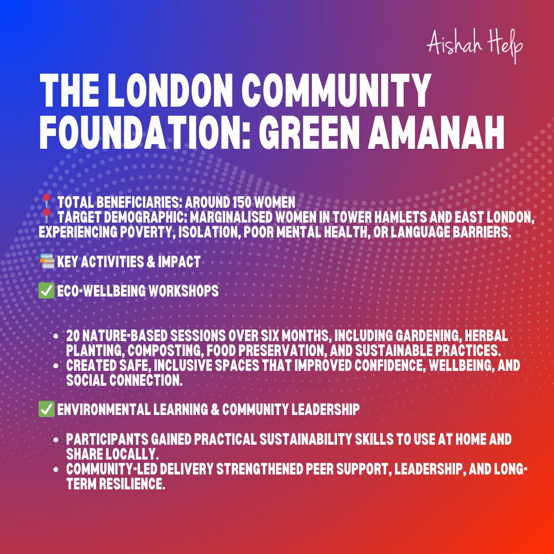 🌿💚 Exciting news! Our new project Green Amanah is launching soon 🌍✨ Thanks to The National Lottery Community Fund, we’ll offer eco-wellbeing workshops, from gardening & composting to jam & balm making, empowering women to care for the Earth while boosting wellbeing and community connections. 🌱🤝 Find out more 👉https://aishahhelp.com/greenamanah…