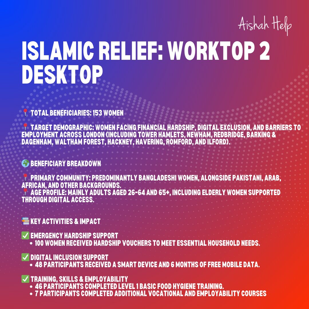 Community Reconnect: Empowering Older People Through Digital Inclusion With funding from the Life Chances Older People’s Digital Grants, Aishah Help successfully delivered the Community Reconnect project, supporting 25 older residents in Tower Hamlets to improve their digital skills and confidence. Key Achievements: ✅ 104 digital skills sessions delivered ✅ 25…
